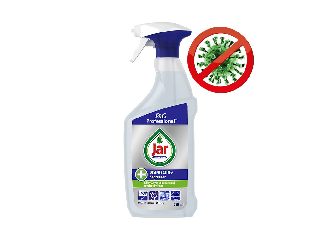 Jar Professional dezinfekční odmašťovač 2v1 odmašťuje a dezinfikuje v jednom kroku a tím šetří Váš čas, námahu a peníze. Je vhodný na čištění, odmaštění a dezinfekci pracovních povrchů v kuchyni včetně povrchů, které přicházejí do styku s potravinami. Velmi účinný je také na umývání kuchyňských spotřebičů a vybavení. Bezpečné použití na většinu umývatelných povrchů jako nerezová ocel, smalt, keramika, mramor. Neparfémovaný, bezbarvý a bez obsahu bělidla. Dezinfikuje v souladu s evropskými normami: EN 1276, EN 13697, EN 14476 + A2, EN 1650 (bakterie a obalené viry 15 sekund, kvasinky 5 minut). Po použití je nutné plochu omýt pitnou vodou. Biocidní (dezinfekční) prostředky používejte zodpovědně dle návodu k použití.