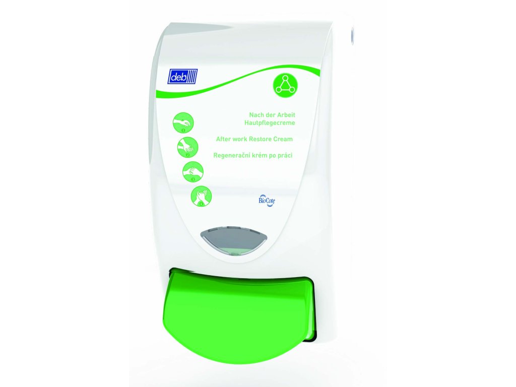 Dávkovač pro 1l patrony DEB s renegeračním krémem, s barevným kódováním a piktogramy pro správné použití. S životní zárukou. Povrch je ošetřen stříbro-iontovou vrstvou Biocote® zajišťující účinnou redukci mikroorganismů.